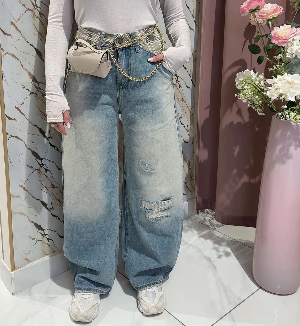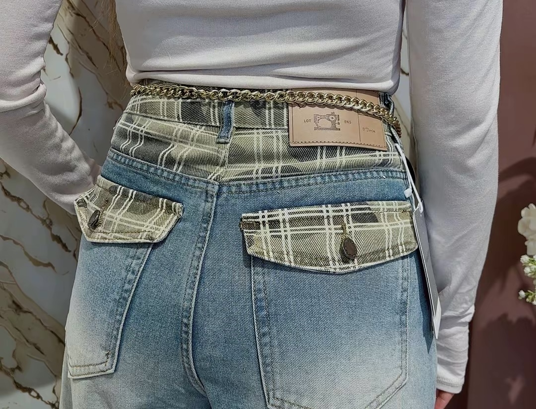 Jeans in denim poco elastico con vestibilità strutturata e confortevole. Il modello presenta tasche posteriori funzionali e un originale bordo della vita con dettaglio verde a quadri, che aggiunge un tocco distintivo al design.Â