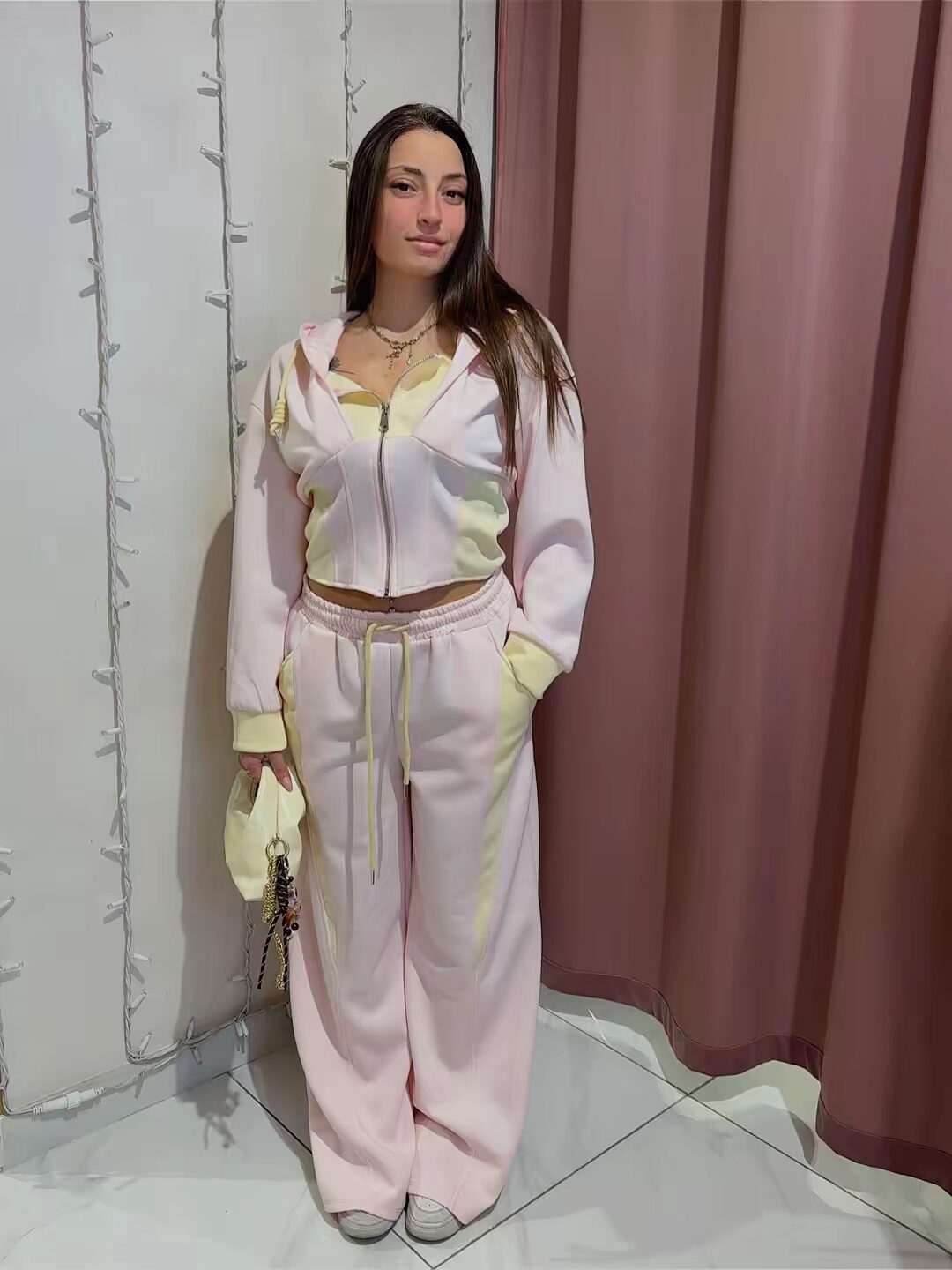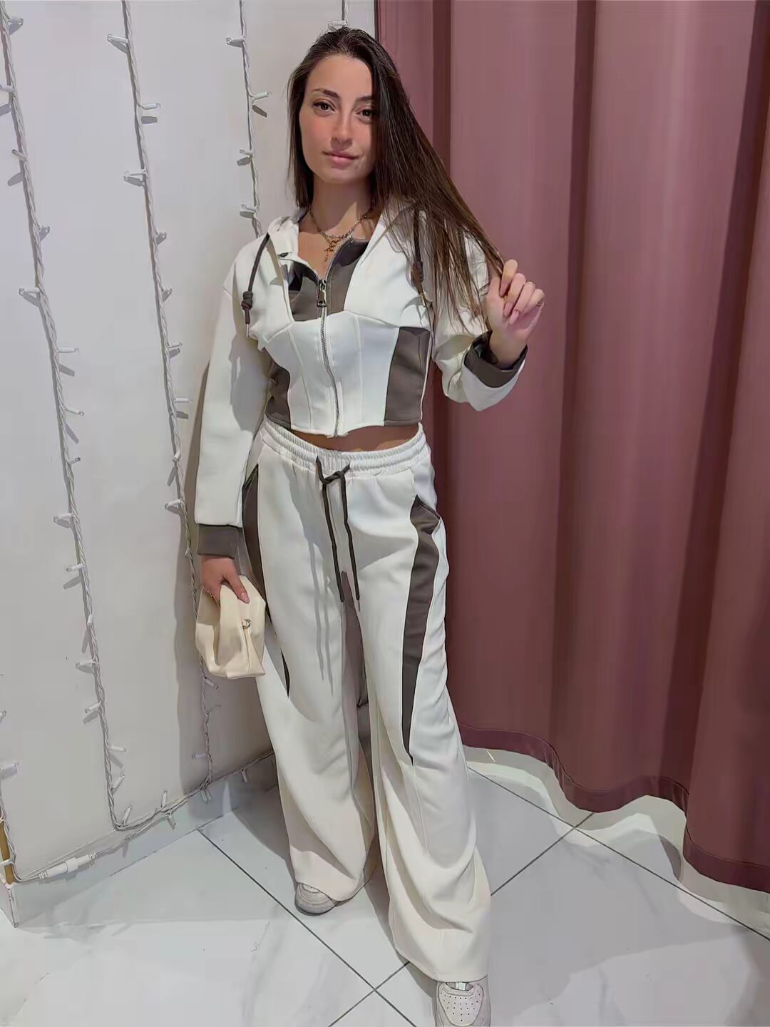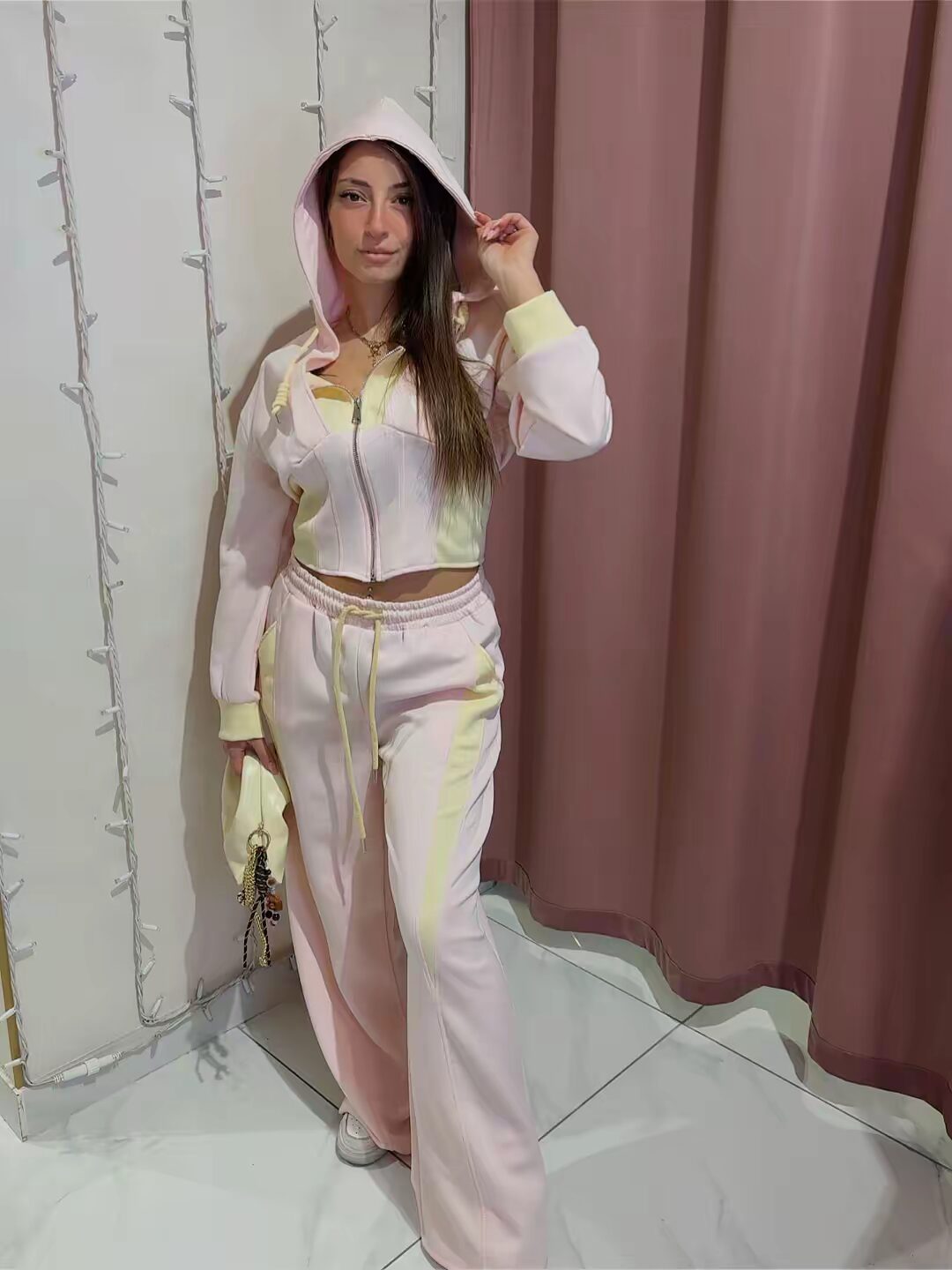 Tuta due pezzi bicolore con giacca con cappuccio e zip, perfetta per il look casual e sportivo. Comoda e pratica. Veste dalla XS alla L/XL.